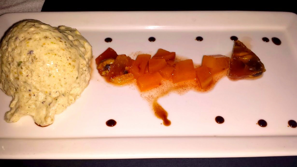 And finally a pistachio semifredo with champagne peach compote, caramel pistachios and a 10 year aged balsalmic.